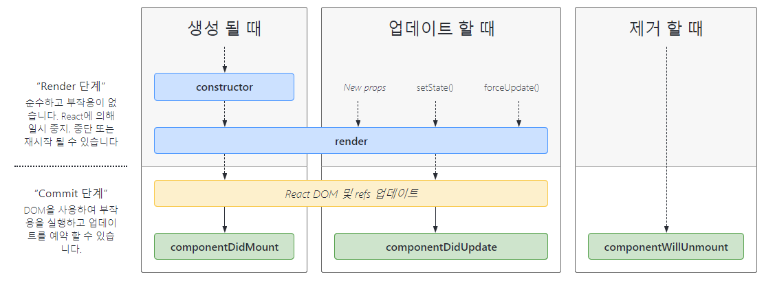 props 또는 state가 변경되면 갱신이 발생. 컴포턴트가 다시 렌더링 될 때 순서대로 호출