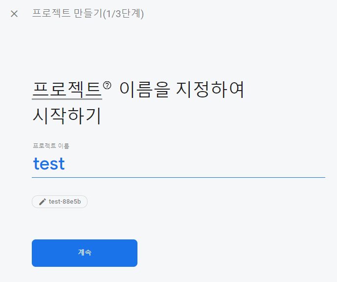 프로젝트 이름은 test로 했지만 중복된 네임이기 때문에 아래의 test-88e5b가 내가 사용할 고유코드가 된다.